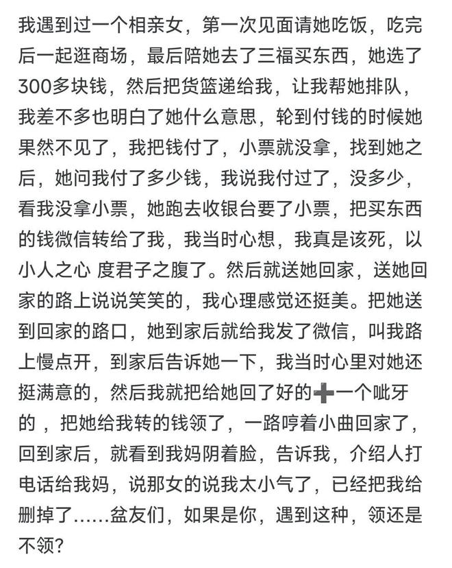 今日话题:你相亲过吗?接下来小编就带领大家看看网友们是如何看待这个问题的。许多年前,有人向我介绍了一个人。会后,我们交换了联系方式,这很正常。但从那以后,无论我如何努力预约,他都无法预约。他也阻止了我,只是假装其他人不喜欢我,什么也没说。但很快,高潮就来了。对方阿姨上班时找到我,问我为什么不跟她侄女约会?他还骂我是渣男。他们阻止了我,我怎么能和他们约会呢?我连手里都没有握着,所以连机会都没有。后来我发现,别人不喜欢我,但别人却喜欢我。但别人不喜欢他,而且我的家庭条件也比那个人好。他后悔挡住了我,所以开始闹事。我和我丈夫去相亲了。当我们第一次见面时,我说我们一起出去玩,了解一下你。我有一个好的对你的印象。说了条件一、二、三后,我说,我只想找个稳定的人在一起。你遇见了我,并向我解释了条件。如果行得通的话,我们就可以结婚了,如果行不通的话,就及时回复我吧。需要一个月的时间,然后大概两三天就会回复。我儿子现在上初中了。 ,我觉得我们去相亲了,没必要去尝试,有效的话就拒绝吧,别带一堆东西去见女朋友父母,他们不让我进去,他们让我去他自己的店里。女孩的妈妈告诉我,我和她女儿不是男女朋友,我们不是伴侣,我们不能拥有东西,所以我把所有东西都拿回来了。上次相亲已经是几年前的事了。一位同学介绍了他的同事。我去了大姐提前预定的一家咖啡店,到达时她戴着变色眼镜,穿着黑色风衣。他走起路来就像遇到了间谍一样。后c他愣了一下,声称自己出身名门望族,家里的人都受过教育。然后他说他必须有BBA才能和她约会,他觉得开日本车会很便宜。当我离开时,我会去大型购物中心买一杯。我说我的眼镜是从淘宝买的。它们非常划算,处方准确,而且舒适。人们说这个商场有蔡司,但他们只在蔡司买眼镜。然后我关掉电源,开着那辆蹩脚的丰田车回家。我回家后就把它取下来了。看完这些网友的精彩分享,手机屏幕前的你是不是也有话要说呢?欢迎大家在评论区留言。